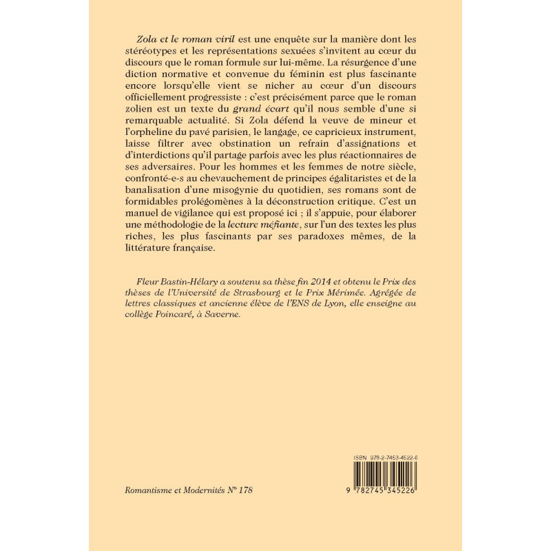 Zola et le roman viril est une enquête sur la manière dont les stéréotypes et les représentations sexuées s’invitent au cœur du discours que le roman formule sur lui-même. La résurgence d’une diction normative et convenue du féminin est plus fascinante encore lorsqu’elle vient se nicher au cœur d’un discours officiellement progressiste : c’est précisément parce que le roman zolien est un texte du grand écart qu’il nous semble d’une si remarquable actualité. Si Zola défend la veuve de mineur et l’orpheline du pavé parisien, le langage, ce capricieux instrument, laisse filtrer avec obstination un refrain d’assignations et d’interdictions qu’il partage parfois avec les plus réactionnaires de ses adversaires. Pour les hommes et les femmes de notre siècle, confronté-e-s au chevauchement de principes égalitaristes et de la banalisation d’une misogynie du quotidien, ses romans sont de formidables prolégomènes à la déconstruction critique. C’est un manuel de vigilance qui est proposé ici ; il s’appuie, pour élaborer une méthodologie de la lecture méfiante, sur l’un des textes les plus riches, les plus fascinants par ses paradoxes mêmes, de la littérature française.