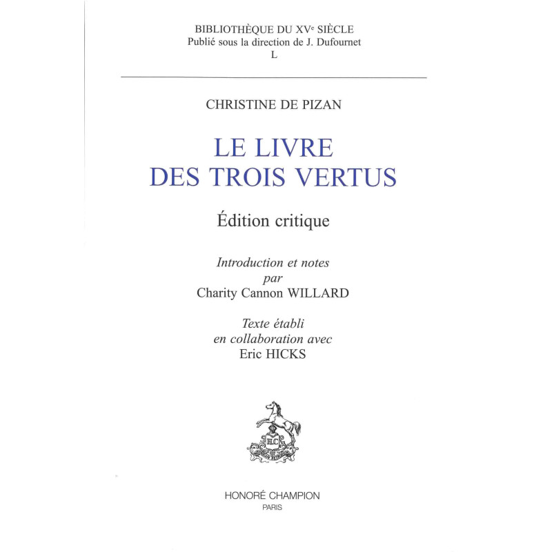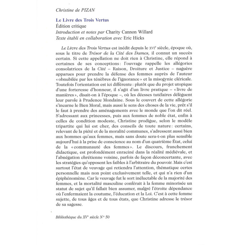 Le Livre des Trois Vertus est inédit depuis le XVIe siècle, époque où, sous le titre de Trésor de la Cité des Dames, il connut un succès certain. Si cette appellation ne doit rien à Christine, elle répond à certaines de ses conceptions : l'ouvrage rappelle les allégories consolatrices de la Cité - Raison, Droiture et Justice - naguère apparues pour prendre la défense des femmes auprès de l'auteur «obnubilée par les ténèbres de l'ignorance » et la misogynie cléricale. Toutefois l'orientation est ici différente : plutôt que du projet utopique d'une forteresse d'honneur, il s'agit d'un livre pratique - « livre de manières », disait-on à l'époque -, où les déesses tutélaires délèguent leur parole à Prudence Mondaine. Sous le couvert de cette allégorie s'incarne le Bien Moral, mais aussi le sens des choses de la vie, prêt s'il le faut à prendre des aménagements avec le monde que l'on dit réel. S'adressant aux princesses, puis aux femmes de noble état, enfin à celles de condition modeste, Christine prodigue, selon le modèle tripartite qui lui est cher, des conseils de toute nature : certains, relevant de la piété et de la moralité communes, s'adressent aussi bien aux hommes qu'aux femmes, mais sans doute sera-t-on plus sensible aujourd'hui à la prise de conscience au nom d'un quatrième Etat, celui de la « communauté des femmes ». Le discours, franchement didactique, est profondément enraciné dans la réalité médiévale, et l'abnégation chrétienne voisine, parfois de façon déconcertante, avec les stratégies qu'opposent les faibles à l'arbitraire du pouvoir. Mais c'est surtout l'état de veuvage qui retiendra l'attention, thématique certes personnelle mais non point exclusivement telle, et qui n'a rien d'un épiphénomène. Car le veuvage fut le sort inéluctable de la majorité des femmes, et la mortalité masculine conférait à la femme minorisée un statut de sujet qu'il fallait bien assumer, malgré l'étroite dépendance où l'enfermaient la coutume, l'éducation et la Loi. C'est à cette femme sujette, de tous âges et de tous états, que Christine adresse le trésor de sa sagesse.