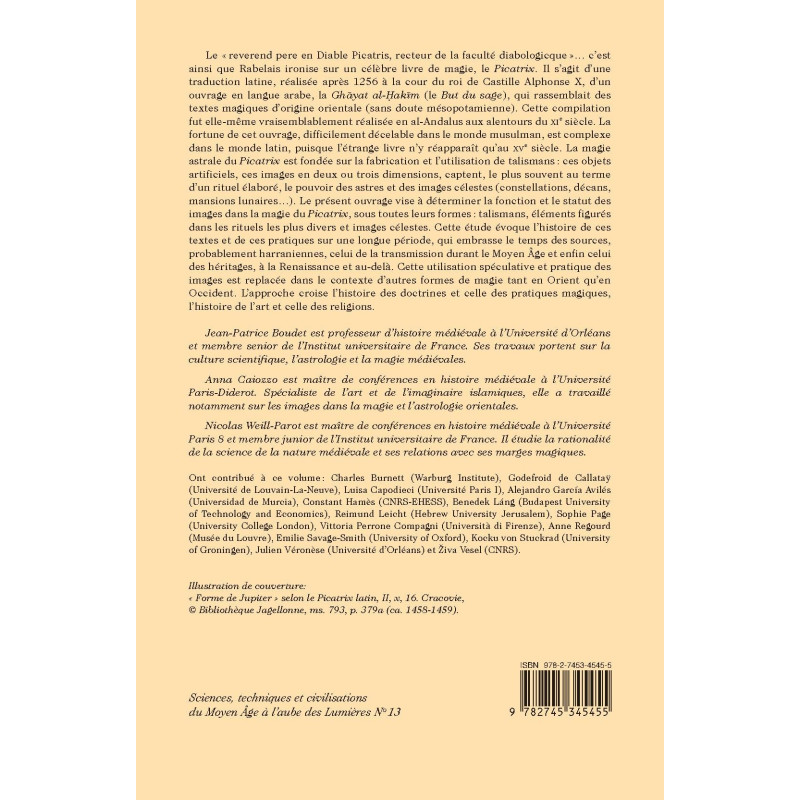 Le « reverend pere en Diable Picatris, recteur de la faculté diabologicque »… c’est ainsi que Rabelais ironise sur un célèbre livre de magie, le Picatrix. Il s’agit d’une traduction latine, réalisée après 1256 à la cour du roi de Castille Alphonse X, d’un ouvrage en langue arabe, la Gh?yat al-?ak?m (le But du sage), qui rassemblait des textes magiques d’origine orientale (sans doute mésopotamienne). Cette compilation fut elle-même vraisemblablement réalisée en al-Andalus aux alentours du XIe siècle. La fortune de cet ouvrage, difficilement décelable dans le monde musulman, est complexe dans le monde latin, puisque l’étrange livre n’y réapparaît qu’au XVe siècle. La magie astrale du Picatrix est fondée sur la fabrication et l’utilisation de talismans : ces objets artificiels, ces images en deux ou trois dimensions, captent, le plus souvent au terme d’un rituel élaboré, le pouvoir des astres et des images célestes (constellations, décans, mansions lunaires…). Le présent ouvrage vise à déterminer la fonction et le statut des images dans la magie du Picatrix, sous toutes leurs formes : talismans, éléments figurés dans les rituels les plus divers et images célestes. Cette étude évoque l’histoire de ces textes et de ces pratiques sur une longue période, qui embrasse le temps des sources, probablement harraniennes, celui de la transmission durant le Moyen Âge et enfin celui des héritages, à la Renaissance et au-delà. Cette utilisation spéculative et pratique des images est replacée dans le contexte d’autres formes de magie tant en Orient qu’en Occident.