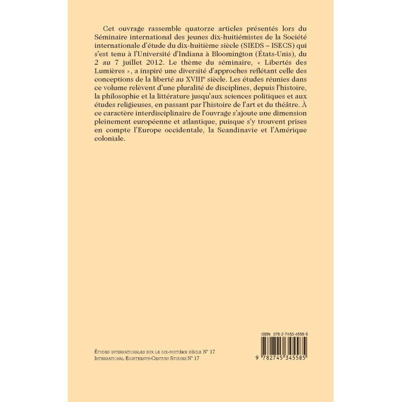 Cet ouvrage rassemble quatorze articles présentés lors du Séminaire international des jeunes dix-huitiémistes de la Société internationale d’étude du dix-huitième siècle (SIEDS – ISECS) qui s’est tenu à l’Université d’Indiana à Bloomington (États-Unis), du 2 au 7 juillet 2012. Le thème du séminaire, « Libertés des Lumières», a inspiré une diversité d’approches reflétant celle des conceptions de la liberté au XVIIIe siècle. Les études réunies dans ce volume relèvent d’une pluralité de disciplines, depuis l’histoire, la philosophie et la littérature jusqu’aux sciences politiques et aux études religieuses, en passant par l’histoire de l’art et du théâtre. À ce caractère interdisciplinaire de l’ouvrage s’ajoute une dimension pleinement européenne et atlantique, puisque s’y trouvent prises en compte l’Europe occidentale, la Scandinavie et l’Amérique coloniale.