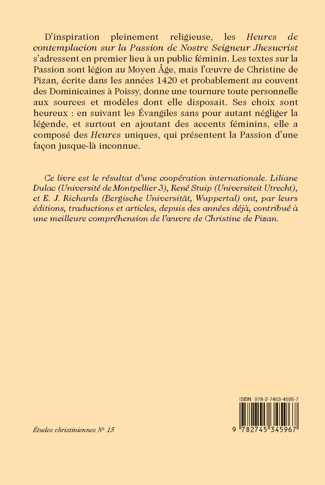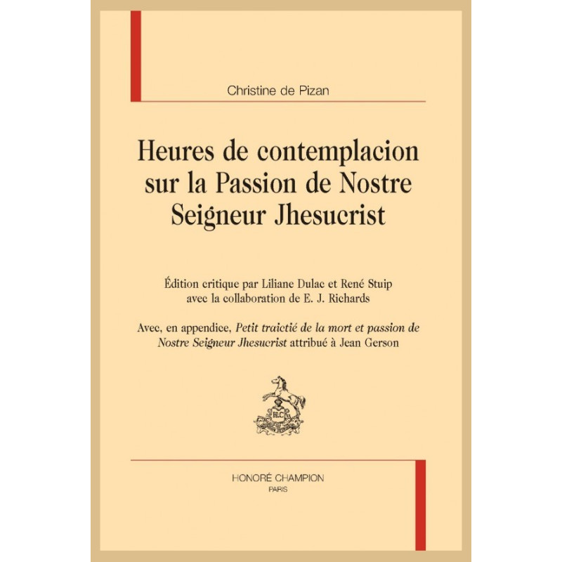 D’inspiration pleinement religieuse, les Heures de contemplacion sur la Passion de Nostre Seigneur Jhesucrist s’adressent en premier lieu à un public féminin. Les textes sur la Passion sont légion au Moyen Âge, mais l’oeuvre de Christine de Pizan, écrite dans les années 1420 et probablement au couvent des Dominicaines à Poissy, donne une tournure toute personnelle aux sources et modèles dont elle disposait. Ses choix sont heureux : en suivant les Évangiles sans pour autant négliger la légende, et surtout en ajoutant des accents féminins, elle a composé des Heures uniques, qui présentent la Passion d’une façon jusque-là inconnue.