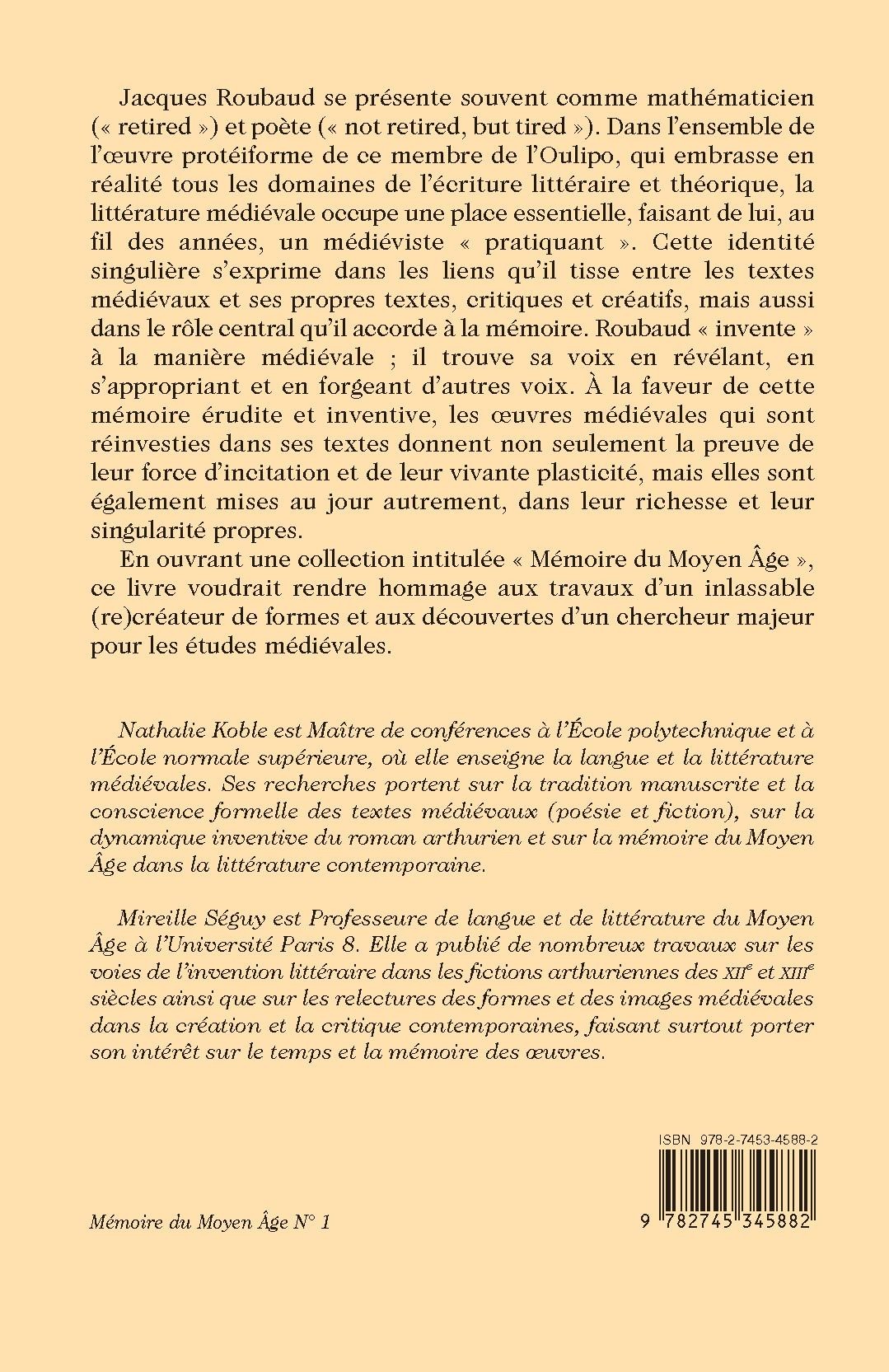 Jacques Roubaud se présente souvent comme mathématicien (« retired ») et poète (« not retired, but tired »). Dans l’ensemble de l’oeuvre protéiforme de ce membre de l’Oulipo, qui embrasse en réalité tous les domaines de l’écriture littéraire et théorique, la littérature médiévale occupe une place essentielle, faisant de lui, au fil des années, un médiéviste « pratiquant ». Cette identité singulière s’exprime dans les liens qu’il tisse entre les textes médiévaux et ses propres textes, critiques et créatifs, mais aussi dans le rôle central qu’il accorde à la mémoire. Roubaud « invente » à la manière médiévale ; il trouve sa voix en révélant, en s’appropriant et en forgeant d’autres voix. À la faveur de cette mémoire érudite et inventive, les œuvres médiévales qui sont réinvesties dans ses textes donnent non seulement la preuve de leur force d’incitation et de leur vivante plasticité, mais elles sont également mises au jour autrement, dans leur richesse et leur singularité propres.