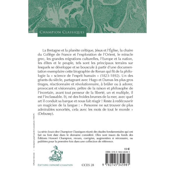 La Bretagne et la planète celtique, Jésus et l’Église, la chaire du Collège de France et l’exploration de l’Orient, le miracle grec, les grandes migrations culturelles, l’Europe et la nation, les élites et le peuple, tels sont les principaux terrains sur lesquels se développe et se bouscule à partir d’une documentation exemplaire cette biographie de Renan qui fit de la philologie la « science de l’esprit humain » (1823-1892). Un des géants du siècle, partageant avec Hugo et Dumas les plus gros tirages, réactionnaire et révolutionnaire, à brûler ou à adorer, provocant et visionnaire, prêtre de la raison et philosophe de l’incertain, avant tout penseur de la liberté, un et multiple, il est l’inclassable. Et, né des froides brumes de la mer, avec quel art il conduit sa barque et nous fait réagir ! Reste à redécouvrir un magicien de la langue : « Personne ne sut trouver de plus admirables sonorités, cela avec les mots de tout le monde » (Debussy).