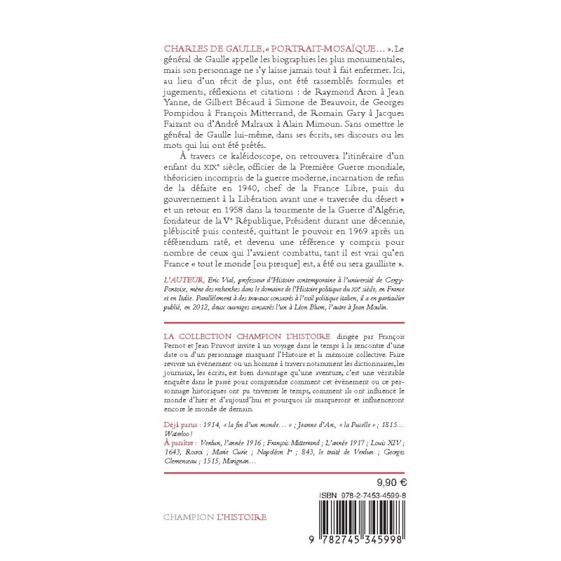 À travers ce kaléidoscope, on retrouvera l’itinéraire d’un enfant du XIXe siècle, officier de la Première Guerre mondiale, théoricien incompris de la guerre moderne, incarnation de refus de la défaite en 1940, chef de la France Libre, puis du gouvernement à la Libération avant une « traversée du désert » et un retour en 1958 dans la tourmente de la Guerre d’Algérie, fondateur de la Ve République, Président durant une décennie, plébiscité puis contesté, quittant le pouvoir en 1969 après un référendum raté, et devenu une référence y compris pour nombre de ceux qui l’avaient combattu, tant il est vrai qu’en France « tout le monde [ou presque] est, a été ou sera gaulliste ».