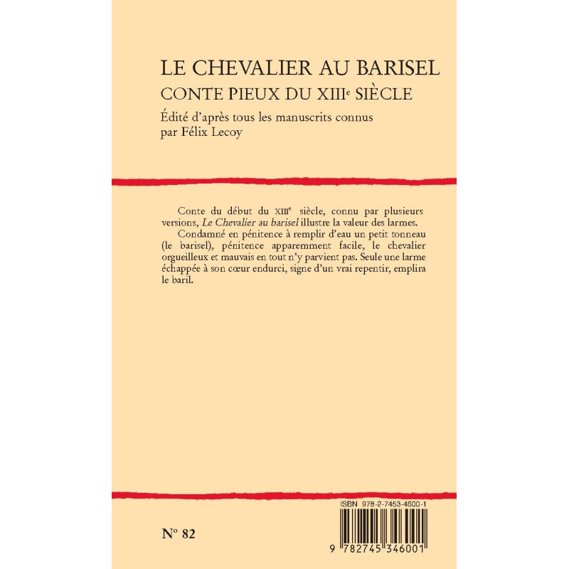 Conte du début du XIIIe siècle, connu par plusieurs versions, Le Chevalier au barisel illustre la valeur des larmes. Condamné en pénitence à remplir d’eau un petit tonneau (le barisel), pénitence apparemment facile, le chevalier orgueilleux et mauvais en tout n’y parvient pas. Seule une larme échappée à son cœur endurci, signe d’un vrai repentir, emplira le baril.