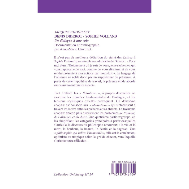 Il n’est pas de meilleure définition du statut des Lettres à Sophie Volland que cette phrase admirable de Diderot : « Pour moi dans l’éloignement où je suis de vous, je ne sache rien qui vous rapproche de moi, comme de vous dire tout et de vous rendre présente à mes actions par mon récit ». Le langage de l’absence se solde donc par un supplément de présence. À partir de cette hypothèse de travail, la présente étude aborde successivement quatre aspects.