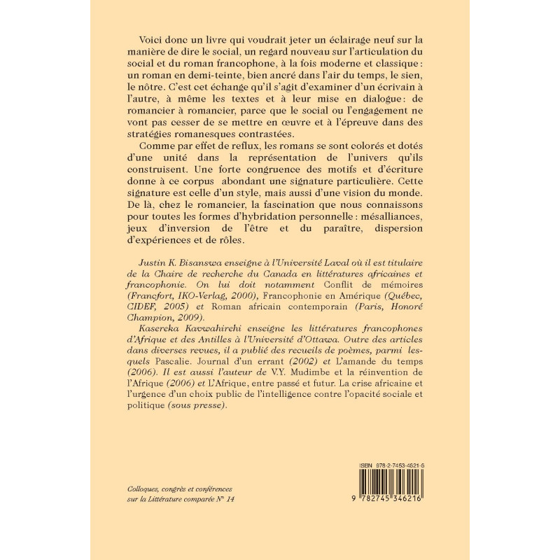 Voici donc un livre qui voudrait jeter un éclairage neuf sur la manière de dire le social, un regard nouveau sur l’articulation du social et du roman francophone, à la fois moderne et classique : un roman en demi-teinte, bien ancré dans l’air du temps, le sien, le nôtre. C’est cet échange qu’il s’agit d’examiner d’un écrivain à l’autre, à même les textes et à leur mise en dialogue : de romancier à romancier, parce que le social ou l’en agement ne vont pas cesser de se mettre en oeuvre et à l’épreuve dans des stratégies romanesques contrastées.