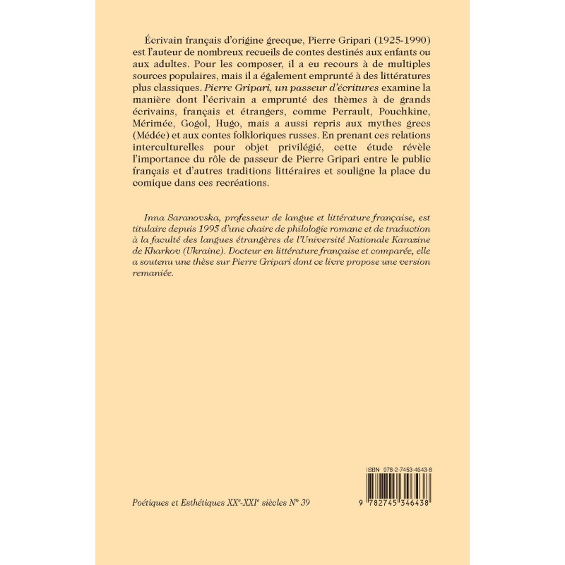 Écrivain français d’origine grecque, Pierre Gripari (1925-1990) est l’auteur de nombreux recueils de contes destinés aux enfants ou aux adultes. Pour les composer, il a eu recours à de multiples sources populaires, mais il a également emprunté à des littératures plus classiques. Pierre Gripari, un passeur d’écritures examine la manière dont l’écrivain a emprunté des thèmes à de grands écrivains, français et étrangers, comme Perrault, Pouchkine, Mérimée, Gogol, Hugo, mais a aussi repris aux mythes grecs (Médée) et aux contes folkloriques russes. En prenant ces relations interculturelles pour objet privilégié, cette étude révèle l’importance du rôle de passeur de Pierre Gripari entre le public français et d’autres traditions littéraires et souligne la place du comique dans ces recréations.