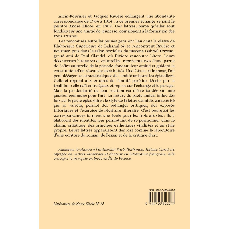 Les rencontres entre les jeunes gens ont lieu dans la classe de Rhétorique Supérieure de Lakanal où se rencontrent Rivière et Fournier, puis dans le salon bordelais du mécène Gabriel Frizeau, grand ami de Paul Claudel, où Rivière rencontre Lhote. Leurs découvertes littéraires et culturelles, représentatives d’une partie de l’offre culturelle de la période, fondent leur amitié et guident la constitution d’un réseau de sociabilités. Une fois ce cadre posé, l’on peut dégager les caractéristiques de l’amitié unissant les épistoliers. Celle-ci répond aux critères de l’amitié parfaite décrits par la tradition : elle naît entre égaux et repose sur l’échange et le partage. Mais la particularité de leur relation est d’être fondée sur une passion commune pour l’art. La nature du pacte amical influe dès lors sur le pacte épistolaire : le style de la lettre d’amitié, caractérisé par sa variété, permet des échanges critiques, des exposés théoriques et l’exercice de l’écriture littéraire. C’est pourquoi les correspondances forment une école pour les trois artistes : ils y élaborent des identités leur permettant de se positionner dans le champ artistique, des principes esthétiques vitalistes et un style propre. Leurs lettres apparaissent dès lors comme le laboratoire d’une écriture du roman, de l’essai et de la critique d’art.