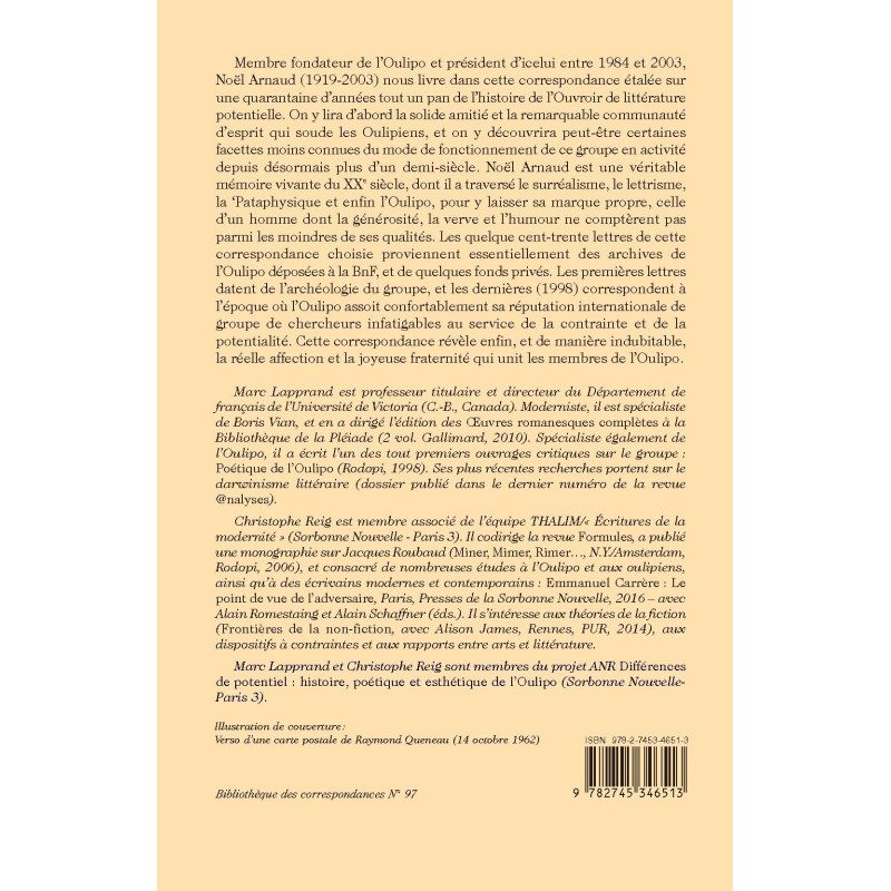 Membre fondateur de l’Oulipo et président d’icelui entre 1984 et 2003, Noël Arnaud (1919-2003) nous livre dans cette correspondance étalée sur une quarantaine d’années tout un pan de l’histoire de l’Ouvroir de littérature potentielle. On y lira d’abord la solide amitié et la remarquable communauté d’esprit qui soude les Oulipiens, et on y découvrira peut-être certaines facettes moins connues du mode de fonctionnement de ce groupe en activité depuis désormais plus d’un demi-siècle. Noël Arnaud est une véritable mémoire vivante du XXe siècle, dont il a traversé le surréalisme, le lettrisme, la ‘Pataphysique et enfin l’Oulipo, pour y laisser sa marque propre, celle d’un homme dont la générosité, la verve et l’humour ne comptèrent pas parmi les moindres de ses qualités. Les quelque cent-trente lettres de cette correspondance choisie proviennent essentiellement des archives de l’Oulipo déposées à la BnF, et de quelques fonds privés. Les premières lettres datent de l’archéologie du groupe, et les dernières (1998) correspondent à l’époque où l’Oulipo assoit confortablement sa réputation internationale de groupe de chercheurs infatigables au service de la contrainte et de la potentialité. Cette correspondance révèle enfin, et de manière indubitable, la réelle affection et la joyeuse fraternité qui unit les membres de l’Oulipo.