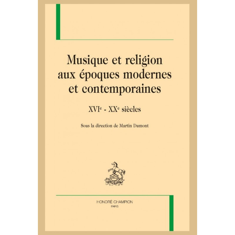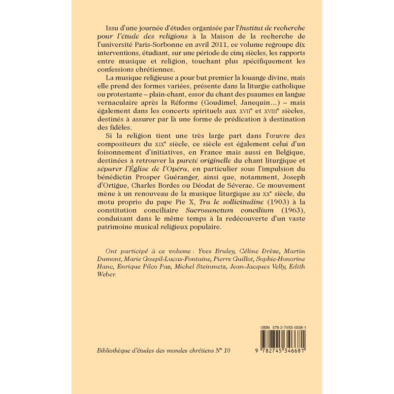 Issu d’une journée d’études organisée par l’Institut de recherche pour l’étude des religions à la Maison de la recherche de l’université Paris-Sorbonne en avril 2011, ce volume regroupe dix interventions, étudiant, sur une période de cinq siècles, les rapports entre musique et religion, touchant plus spécifiquement les confessions chrétiennes.