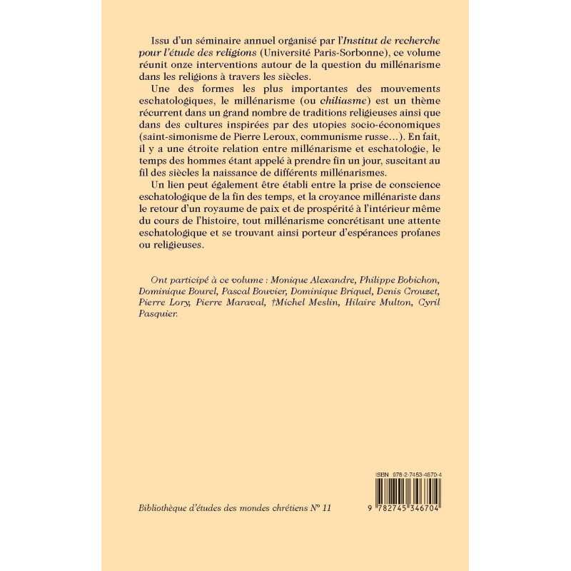 Issu d’un séminaire annuel organisé par l’Institut de recherche pour l’étude des religions (Université Paris-Sorbonne), ce volume réunit onze interventions autour de la question du millénarisme dans les religions à travers les siècles.