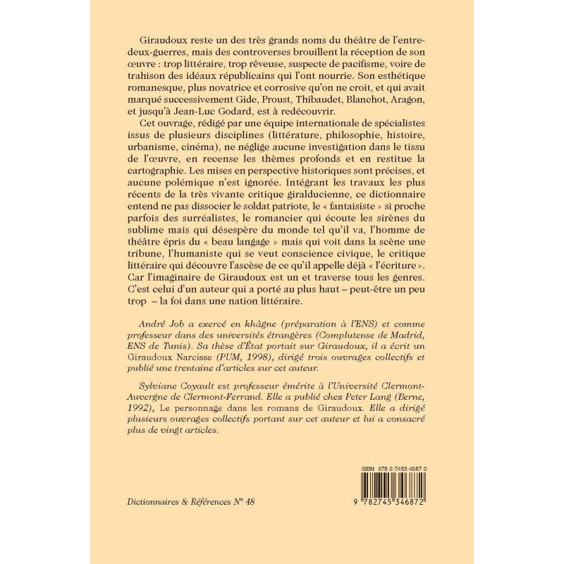 Cet ouvrage, rédigé par une équipe internationale de spécialistes issus de plusieurs disciplines (littérature, philosophie, histoire, urbanisme, cinéma), ne néglige aucune investigation dans le tissu de l’oeuvre, en recense les thèmes profonds et en restitue la cartographie. Les mises en perspective historiques sont précises, et aucune polémique n’est ignorée. Intégrant les travaux les plus récents de la très vivante critique giralducienne, ce dictionnaire entend ne pas dissocier le soldat patriote, le « fantaisiste » si proche parfois des surréalistes, le romancier qui écoute les sirènes du sublime mais qui désespère du monde tel qu’il va, l’homme de théâtre épris du « beau langage » mais qui voit dans la scène une tribune, l’humaniste qui se veut conscience civique, le critique littéraire qui découvre l’ascèse de ce qu’il appelle déjà « l’écriture ». Car l’imaginaire de Giraudoux est un et traverse tous les genres. C’est celui d’un auteur qui a porté au plus haut – peut-être un peu trop – la foi dans une nation littéraire.