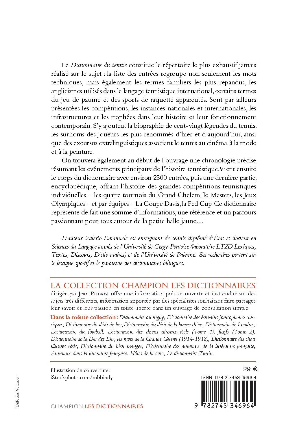 Le Dictionnaire du tennis constitue le répertoire le plus exhaustif jamais réalisé sur le sujet : la liste des entrées regroupe non seulement les mots techniques, mais également les termes familiers les plus répandus, les anglicismes utilisés dans le langage tennistique international, certains termes du jeu de paume et des sports de raquette apparentés. Sont par ailleurs présentées les compétitions, les instances nationales et internationales, les infrastructures et les trophées dans leur histoire et leur fonctionnement contemporain. S’y ajoutent la biographie de cent-vingt légendes du tennis, les surnoms des joueurs les plus renommés d’hier et d’aujourd’hui, ainsi que des excursus extralinguistiques associant le tennis au cinéma, à la mode et à la peinture.