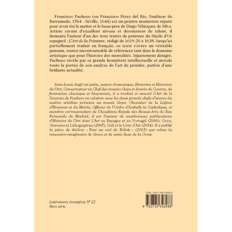 Francisco Pacheco (ou Francisco Pérez del Río, Sanlúcar de Barrameda, 1564 - Séville, 1644) est un peintre maniériste réputé pour avoir été le maître et le beau-père de Diego Velázquez de Silva. Artiste savant d’excellent niveau et dessinateur de talent, il demeure l’auteur d’un des trois traités de peinture du Siècle d’Or espagnol : L’Art de la Peinture, rédigé de 1619-20 à 1638. Jusqu’ici partiellement traduit en français, ce texte s’avère un véritable pensum, source incontournable de références tant dans le domaine artistique que pour l’histoire des mentalités. Injustement dénigré, Pacheco révèle par sa grande honnêteté intellectuelle et morale toute la portée de son analyse de l’art de peindre, parfois d’une brûlante actualité.