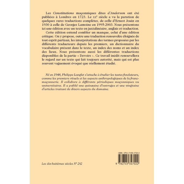 Les Constitutions maçonniques dites d’Anderson ont été publiées à Londres en 1723. Le XXe siècle a vu la parution de quelques rares traductions complètes, de celle d’Ernest Jouin en 1930 à celle de Georges Lamoine en 1995-2003. Nous présentons ici une édition avec un texte en juxtalinéaire, anglais et traduction.