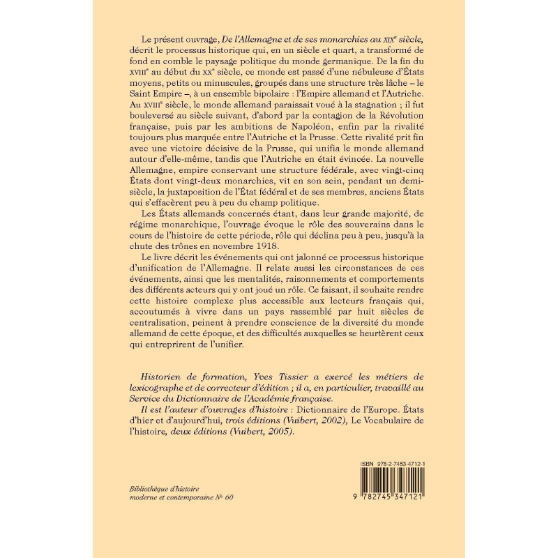 Le présent ouvrage, De l’Allemagne et de ses monarchies au XIXe siècle, décrit le processus historique qui, en un siècle et quart, a transformé de fond en comble le paysage politique du monde germanique. De la fin du XVIIIe au début du XXe siècle, ce monde est passé d’une nébuleuse d’États moyens, petits ou minuscules, groupés dans une structure très lâche – le Saint Empire –, à un ensemble bipolaire : l’Empire allemand et l’Autriche. Au XVIIIe siècle, le monde allemand paraissait voué à la stagnation ; il fut bouleversé au siècle suivant, d’abord par la contagion de la Révolution française, puis par les ambitions de Napoléon, enfin par la rivalité toujours plus marquée entre l’Autriche et la Prusse. Cette rivalité prit fin avec une victoire décisive de la Prusse, qui unifia le monde allemand autour d’elle-même, tandis que l’Autriche en était évincée. La nouvelle Allemagne, empire conservant une structure fédérale, avec vingt-cinq États dont vingt-deux monarchies, vit en son sein, pendant un demi-siècle, la juxtaposition de l’État fédéral et de ses membres, anciens États qui s’effacèrent peu à peu du champ politique.