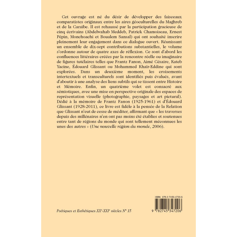 Cet ouvrage est né du désir de développer des faisceaux comparatistes originaux entre les aires géoculturelles du Maghreb et de la Caraïbe. Il est rehaussé par la participation gracieuse de cinq écrivains (Abdelwahab Meddeb, Patrick Chamoiseau, Ernest Pépin, Monchoachi et Boualem Sansal) qui ont souhaité inscrire pleinement leur engagement dans ce dialogue ouvert. Réunissant un ensemble de dix-sept contributions substantielles, le volume s’ordonne autour de quatre axes de réflexion. Ce sont d’abord les confluences littéraires créées par la rencontre réelle ou imaginaire de figures tutélaires telles que Frantz Fanon, Aimé Césaire, Kateb Yacine, Édouard Glissant ou Mohammed Khaïr-Eddine qui sont explorées. Dans un deuxième moment, les croisements intertextuels et transculturels sont identifiés puis évalués, avant d’aboutir à une analyse des liens subtils qui se tissent entre Histoire et Mémoire. Enfin, un quatrième volet est consacré aux sémiotiques, avec une mise en perspective originale des espaces de représentation visuelle (photographie, paysages et art pictural).