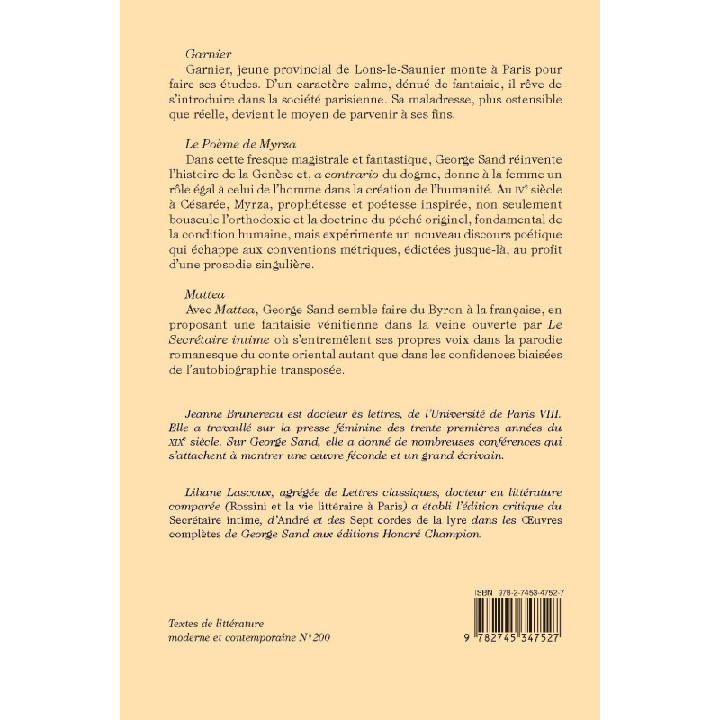 Liliane Lascoux, agrégée de Lettres classiques, docteur en littérature comparée (Rossini et la vie littéraire à Paris) a établi l’édition critique du Secrétaire intime, d’André et des Sept cordes de la lyre dans les Œuvres complètes de George Sand aux éditions Honoré Champion.