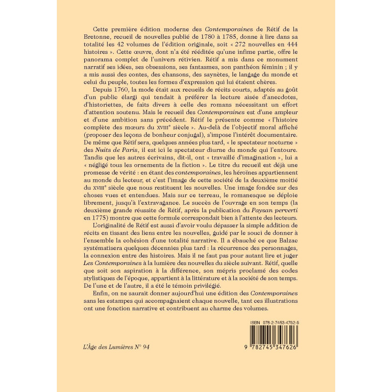Cette première édition moderne des Contemporaines de Rétif de la Bretonne, recueil de nouvelles publié de 1780 à 1785, donne à lire dans sa totalité les 42 volumes de l’édition originale, soit « 272 nouvelles en 444 histoires ». Cette oeuvre, dont n’a été rééditée qu’une infime partie, offre le panorama complet de l’univers rétivien. Rétif a mis dans ce monument narratif ses idées, ses obsessions, ses fantasmes, son panthéon féminin ; il y a mis aussi des contes, des chansons, des saynètes, le langage du monde et celui du peuple, toutes les formes d’expression qui lui étaient chères.
