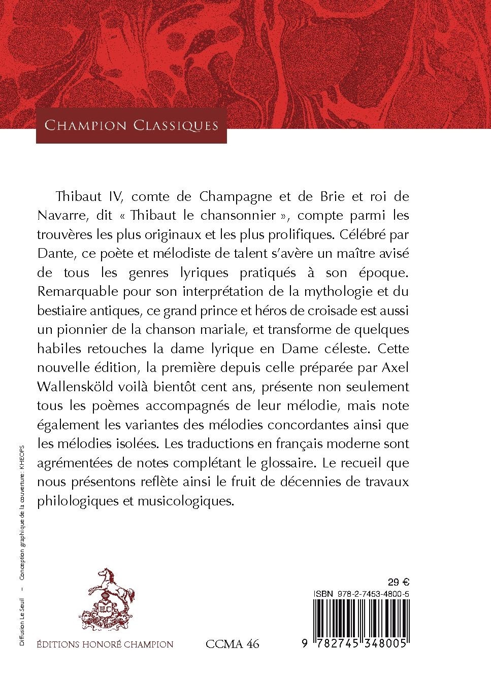 Thibaut IV, comte de Champagne et de Brie et roi de Navarre, dit « Thibaut le chansonnier », compte parmi les trouvères les plus originaux et les plus prolifiques. Célébré par Dante, ce poète et mélodiste de talent s’avère un maître avisé de tous les genres lyriques pratiqués à son époque. Remarquable pour son interprétation de la mythologie et du bestiaire antiques, ce grand prince et héros de croisade est aussi un pionnier de la chanson mariale, et transforme de quelques habiles retouches la dame lyrique en Dame céleste. Cette nouvelle édition, la première depuis celle préparée par Axel Wallensköld voilà bientôt cent ans, présente non seulement tous les poèmes accompagnés de leur mélodie, mais note également les variantes des mélodies concordantes ainsi que les mélodies isolées. Les traductions en français moderne sont agrémentées de notes complétant le glossaire. Le recueil que nous présentons reflète ainsi le fruit de décennies de travaux philologiques et musicologiques.