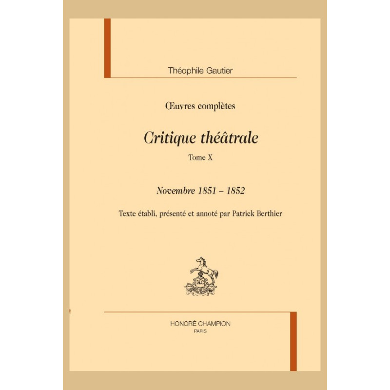 Voici l’édition du feuilleton théâtral de Gautier parvenue à son tome X (novembre 1851-fin 1852). La situation politique (coup d’État du 2 décembre et rétablissement de l’empire) ne suscite chez Gautier aucun commentaire, tout au plus relève-t-il plusieurs fois le retour de la censure préalable. Si ses préférences de feuilletoniste sont connues : opéra, concerts, cirque, petits théâtres, on lira ici des développements particulièrement originaux sur Corneille, Beaumarchais ou Rossini, et des comptes rendus de grande ampleur sur La Dame aux camélias de Dumas fils, L’Imagier de Harlem de Nerval, Le Juif errant d’Halévy.