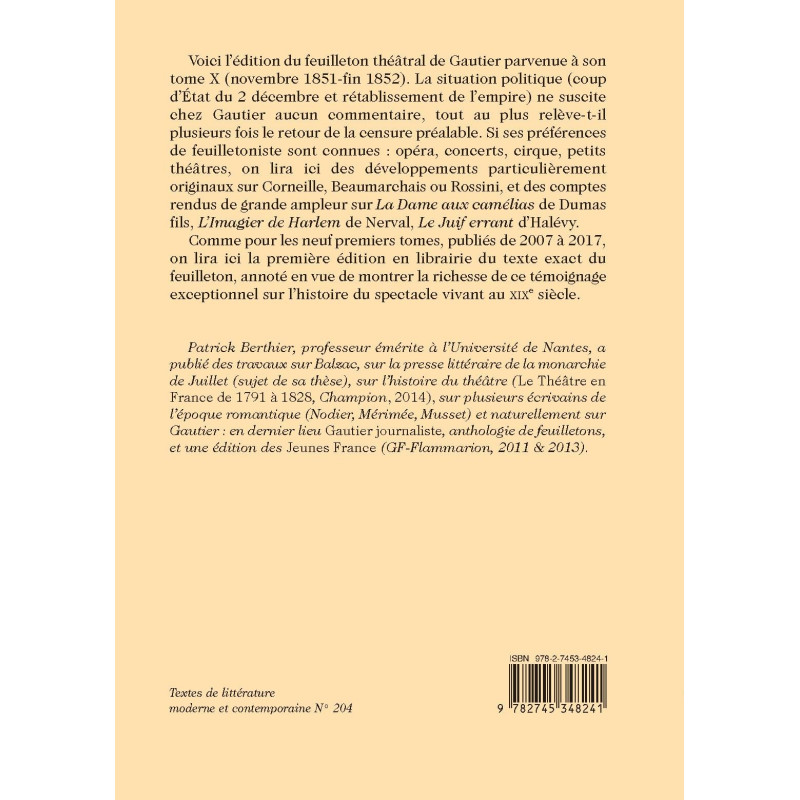 Comme pour les neuf premiers tomes, publiés de 2007 à 2017, on lira ici la première édition en librairie du texte exact du feuilleton, annoté en vue de montrer la richesse de ce témoignage exceptionnel sur l’histoire du spectacle vivant au XIXe siècle.