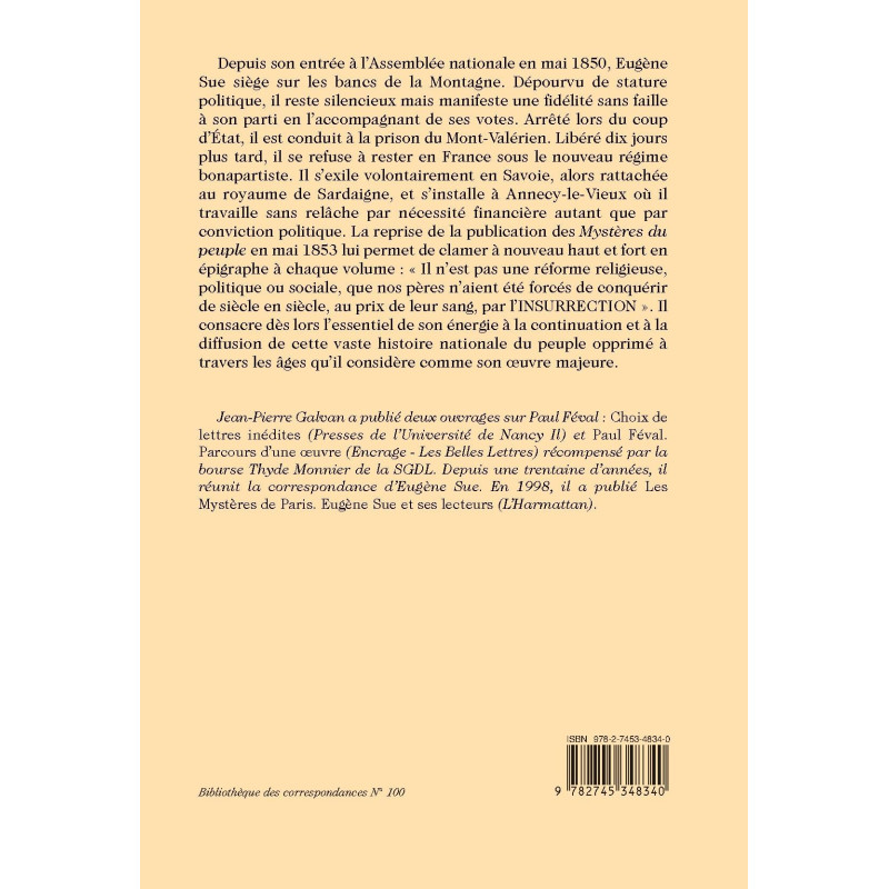Depuis son entrée à l’Assemblée nationale en mai 1850, Eugène Sue siège sur les bancs de la Montagne. Dépourvu de stature politique, il reste silencieux mais manifeste une fidélité sans faille à son parti en l’accompagnant de ses votes. Arrêté lors du coup d’État, il est conduit à la prison du Mont-Valérien. Libéré dix jours plus tard, il se refuse à rester en France sous le nouveau régime bonapartiste. Il s’exile volontairement en Savoie, alors rattachée au royaume de Sardaigne, et s’installe à Annecy-le-Vieux où il travaille sans relâche par nécessité financière autant que par conviction politique. La reprise de la publication des Mystères du peuple en mai 1853 lui permet de clamer à nouveau haut et fort en épigraphe à chaque volume : « Il n’est pas une réforme religieuse, politique ou sociale, que nos pères n’aient été forcés de conquérir de siècle en siècle, au prix de leur sang, par l’INSURRECTION ». Il consacre dès lors l’essentiel de son énergie à la continuation et à la diffusion de cette vaste histoire nationale du peuple opprimé à travers les âges qu’il considère comme son oeuvre majeure.
