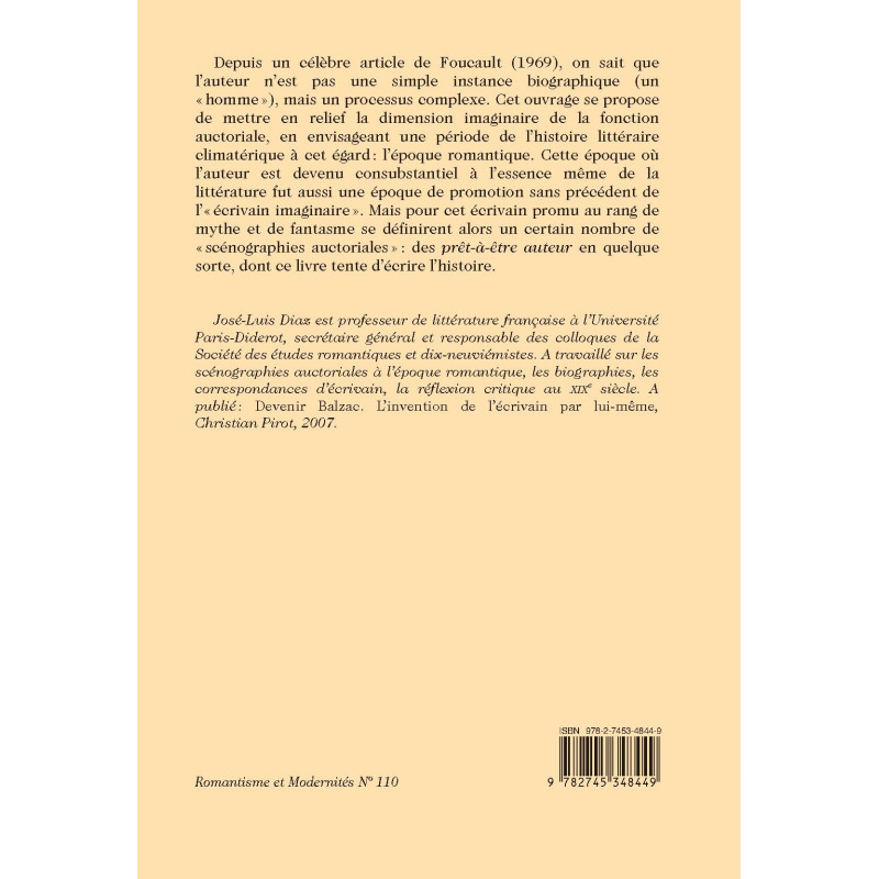 Depuis un célèbre article de Foucault (1969), on sait que l’auteur n’est pas une simple instance biographique (un «homme»), mais un processus complexe. Cet ouvrage se propose de mettre en relief la dimension imaginaire de la fonction auctoriale, en envisageant une période de l’histoire littéraire climatérique à cet égard : l’époque romantique. Cette époque où l’auteur est devenu consubstantiel à l’essence même de la littérature fut aussi une époque de promotion sans précédent de l’« écrivain imaginaire ». Mais pour cet écrivain promu au rang de mythe et de fantasme se définirent alors un certain nombre de « scénographies auctoriales » : des prêt-à-être auteur en quelque sorte, dont ce livre tente d’écrire l’histoire.