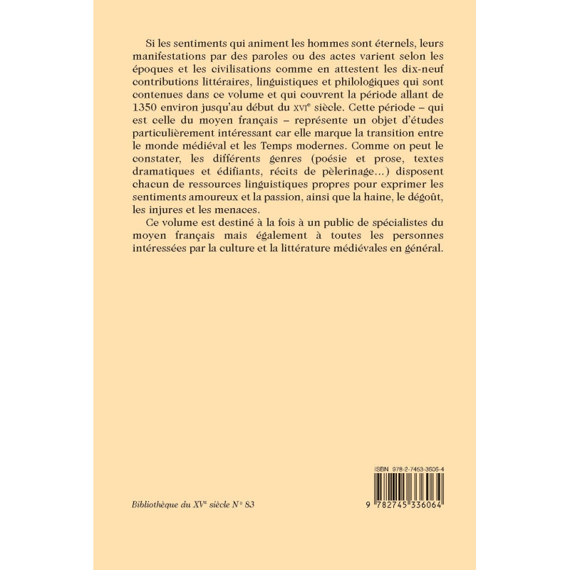 Si les sentiments qui animent les hommes sont éternels, leurs manifestations par des paroles ou des actes varient selon les époques et les civilisations comme en attestent les dix-neuf contributions littéraires, linguistiques et philologiques qui sont contenues dans ce volume et qui couvrent la période allant de 1350 environ jusqu’au début du XVIe siècle. Cette période – qui est celle du moyen français – représente un objet d’études particulièrement intéressant car elle marque la transition entre le monde médiéval et les Temps modernes. Comme on peut le constater, les différents genres (poésie et prose, textes dramatiques et édifiants, récits de pèlerinage…) disposent chacun de ressources linguistiques propres pour exprimer les sentiments amoureux et la passion, ainsi que la haine, le dégoût, les injures et les menaces.