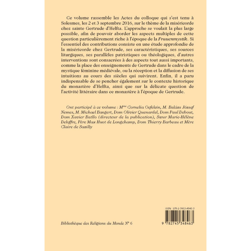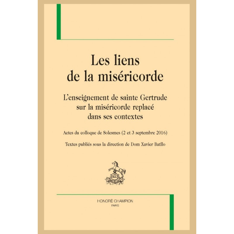 Ce volume rassemble les Actes du colloque qui s’est tenu à Solesmes, les 2 et 3 septembre 2016, sur le thème de la miséricorde chez sainte Gertrude d’Helfta. L’approche se voulait la plus large possible, afin de pouvoir aborder les aspects multiples de cette question particulièrement riche à l’époque de la Frauenmystik. Si l’essentiel des contributions consiste en une étude approfondie de la miséricorde chez Gertrude, ses caractéristiques, ses sources liturgiques, ses parallèles patristiques ou théologiques, d’autres interventions sont consacrées à des aspects tout aussi importants, comme la place des enseignements de Gertrude dans le cadre de la mystique féminine médiévale, ou la réception et la diffusion de ses intuitions au cours des siècles qui suivirent. Enfin, il a paru indispensable de se pencher également sur le contexte historique du monastère d’Helfta, ainsi que sur la délicate question de l’activité littéraire dans ce monastère à l’époque de Gertrude.