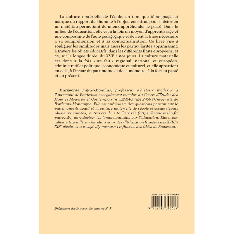 La culture matérielle de l’école, en tant que témoignage et marque du rapport de l’homme à l’objet, constitue pour l’historien un matériau permettant de mieux appréhender le passé. Dans le milieu de l’éducation, elle est à la fois un moyen d’apprentissage et une composante de l’acte pédagogique et devient la trace nécessaire à sa compréhension et à sa contextualisation. Ce livre vise à souligner les similitudes mais aussi les particularités apparaissant, à travers les objets éducatifs, dans les différents États européens, et ce, sur la longue durée, du XVIe à nos jours. La culture matérielle est donc à la fois « un fait » régional, national et européen, administratif et politique, économique et culturel, et elle appartient en cela, à l’instar du patrimoine et de la mémoire, à la fois au passé et au présent.
