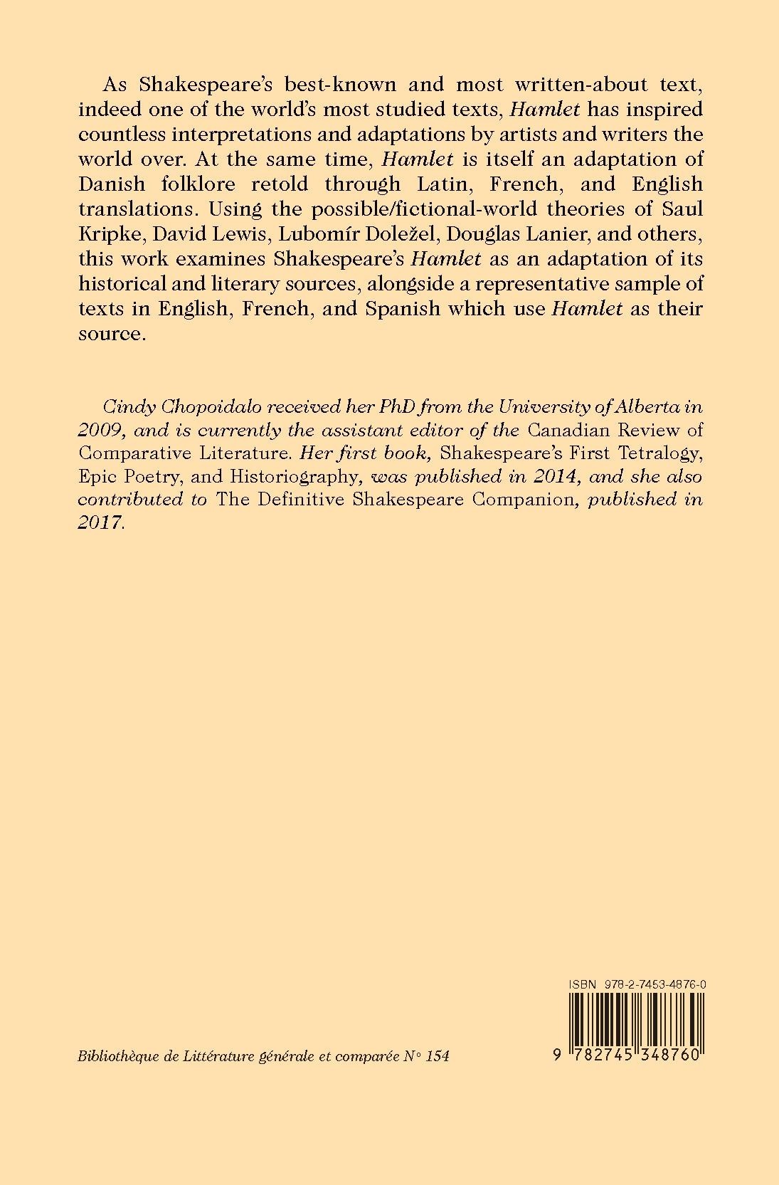 As Shakespeare’s best-known and most written-about text, indeed one of the world’s most studied texts, Hamlet has inspired countless interpretations and adaptations by artists and writers the world over. At the same time, Hamlet is itself an adaptation of Danish folklore retold through Latin, French, and English translations. Using the possible/fictional-world theories of Saul Kripke, David Lewis, Lubomír Doležel, Douglas Lanier, and others, this work examines Shakespeare’s Hamlet as an adaptation of its historical and literary sources, alongside a representative sample of texts in English, French, and Spanish which use Hamlet as their source.