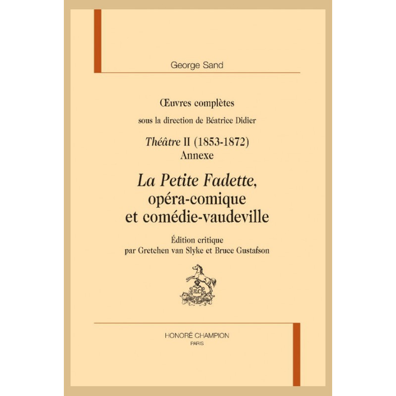 La première représentation de La Petite Fadette eut lieu à l’Opéra-Comique de Paris en 1869 en présence de Théophile Semet qui en composa la musique. Au cours des mois précédents George Sand eut plusieurs échanges avec Adolphe de Leuven, co-directeur de l’Opéra-Comique, à propos de la production ; elle lut le livret de l’opéra-comique et assista au moins à une répétition ainsi qu’à plusieurs représentations. L’opéra-comique s’inspire librement du roman que Sand écrivit en 1848 mais également de la comédie-vaudeville qu’Anicet Bourgeois et Charles Lafont tirèrent du roman de Sand en 1850. Michel Carré écrivit les vers de l’opéra-comique de 1869 ; mais George Sand, elle-même, ne réussit jamais à savoir qui fut responsable du scénario et des dialogues parlés. Les spectateurs parisiens pensaient, comme on le leur disait, que cette version dramatique de La Petite Fadette était de la main de George Sand, qui ne désavoua jamais cette opinion en public. Cette édition présente le livret de l’opéra-comique, une analyse de ses rapports avec le roman de Sand et la comédie-vaudeville du même nom, ainsi qu’une discussion sur la structure musicale et dramatique de l’opéra-comique et la réception de l’oeuvre. En annexe se trouve également le texte de la comédie-vaudeville.
