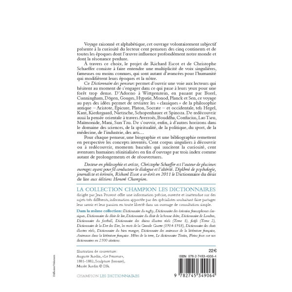 Ce Dictionnaire des penseurs permet d’ouvrir une voie aux lecteurs qui hésitent au moment de s’engager dans ce qui passe à leurs yeux pour une forêt trop dense. D’Adorno à Wittgenstein, en passant par Borel, Cunningham, D?gen, Gouges, Hypatie, Monod, Planck et Sen, ce voyage au pays des idées permet de revisiter les « classiques » de la philosophie antique – Aristote, Épicure, Platon, Socrate – et occidentale, tels Hegel, Kant, Kierkegaard, Nietzsche, Schopenhauer et Spinoza. De redécouvrir aussi la pensée orientale à travers Averroès, Bouddha, Confucius, Lao Tseu, Maïmonide, Mani, Sun Tzu. De s’ouvrir, enfin, à d’autres horizons dans le domaine des sciences, de la spiritualité, de la politique, du sport, de la médecine, de l’industrie, des arts...