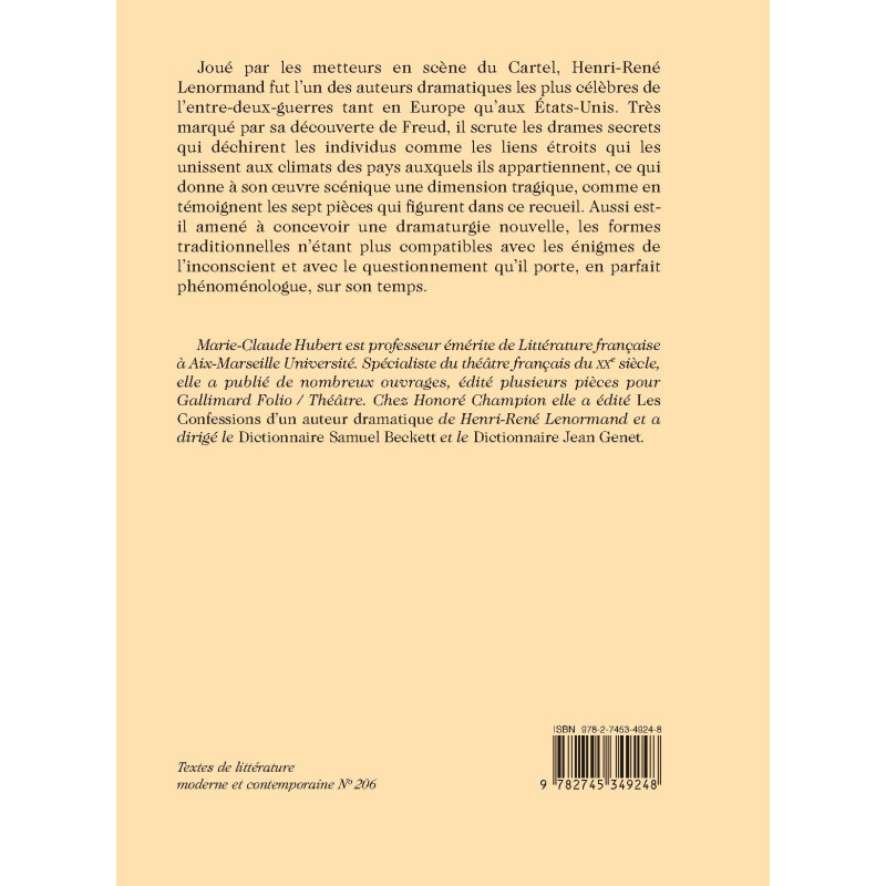 Joué par les metteurs en scène du Cartel, Henri-René Lenormand fut l’un des auteurs dramatiques les plus célèbres de l’entre-deux-guerres tant en Europe qu’aux États-Unis. Très marqué par sa découverte de Freud, il scrute les drames secrets qui déchirent les individus comme les liens étroits qui les unissent aux climats des pays auxquels ils appartiennent, ce qui donne à son oeuvre scénique une dimension tragique, comme en témoignent les sept pièces qui figurent dans ce recueil. Aussi est-il amené à concevoir une dramaturgie nouvelle, les formes traditionnelles n’étant plus compatibles avec les énigmes de l’inconscient et avec le questionnement qu’il porte, en parfait phénoménologue, sur son temps.