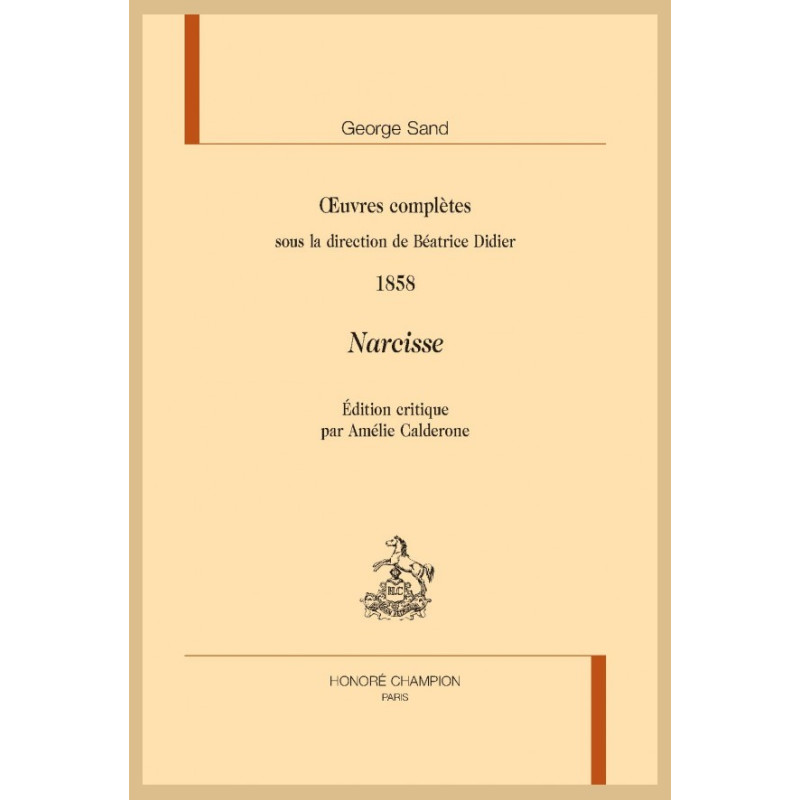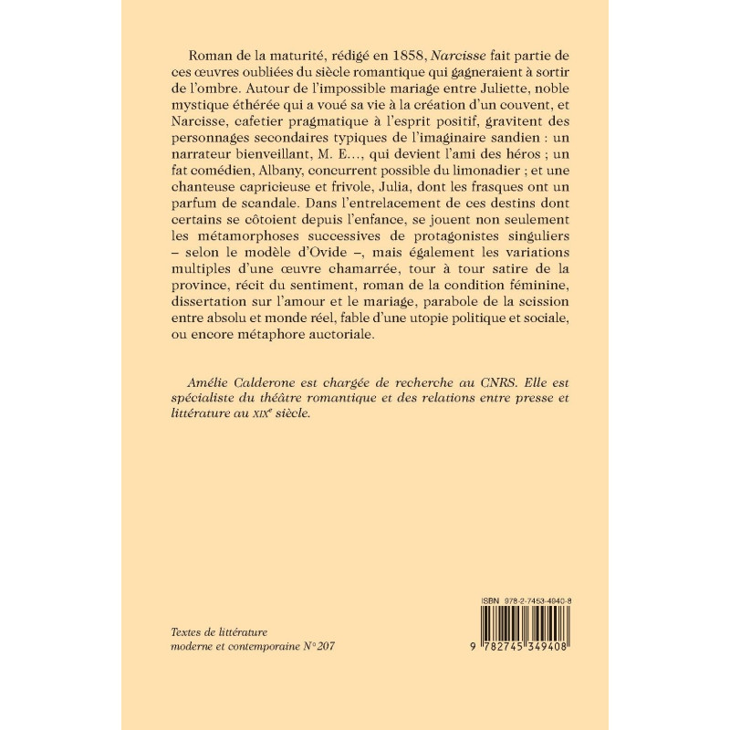 Roman de la maturité, rédigé en 1858, Narcisse fait partie de ces œuvres oubliées du siècle romantique qui gagneraient à sortir de l’ombre. Autour de l’impossible mariage entre Juliette, noble mystique éthérée qui a voué sa vie à la création d’un couvent, et Narcisse, cafetier pragmatique à l’esprit positif, gravitent des personnages secondaires typiques de l’imaginaire sandien : un narrateur bienveillant, M. E…, qui devient l’ami des héros ; un fat comédien, Albany, concurrent possible du limonadier ; et une chanteuse capricieuse et frivole, Julia, dont les frasques ont un parfum de scandale. Dans l’entrelacement de ces destins dont certains se côtoient depuis l’enfance, se jouent non seulement les métamorphoses successives de protagonistes singuliers – selon le modèle d’Ovide –, mais également les variations multiples d’une oeuvre chamarrée, tour à tour satire de la province, récit du sentiment, roman de la condition féminine, dissertation sur l’amour et le mariage, parabole de la scission entre absolu et monde réel, fable d’une utopie politique et sociale, ou encore métaphore auctoriale.