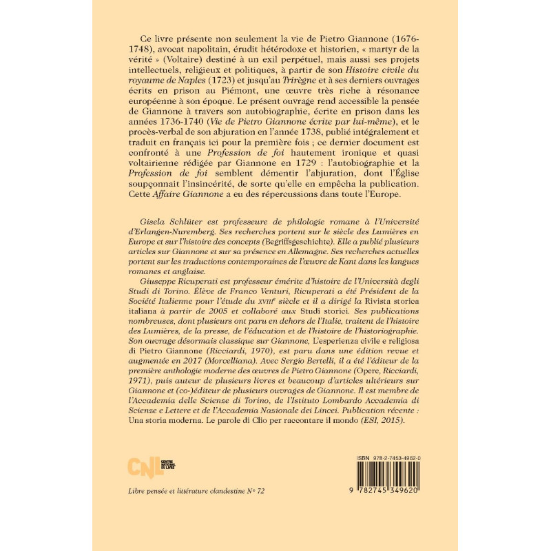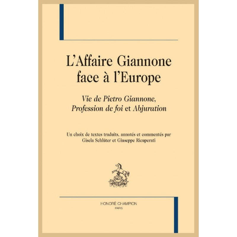 Ce livre présente non seulement la vie de Pietro Giannone (1676- 1748), avocat napolitain, érudit hétérodoxe et historien, « martyr de la vérité » (Voltaire) destiné à un exil perpétuel, mais aussi ses projets intellectuels, religieux et politiques, à partir de son Histoire civile du royaume de Naples (1723) et jusqu’au Trirègne et à ses derniers ouvrages écrits en prison au Piémont, une oeuvre très riche à résonance européenne à son époque. Le présent ouvrage rend accessible la pensée de Giannone à travers son autobiographie, écrite en prison dans les années 1736-1740 (Vie de Pietro Giannone écrite par lui-même), et le procès-verbal de son abjuration en l’année 1738, publié intégralement et traduit en français ici pour la première fois ; ce dernier document est confronté à une Profession de foi hautement ironique et quasi voltairienne rédigée par Giannone en 1729 : l’autobiographie et la Profession de foi semblent démentir l’abjuration, dont l’Église soupçonnait l’insincérité, de sorte qu’elle en empêcha la publication. Cette Affaire Giannone a eu des répercussions dans toute l’Europe.