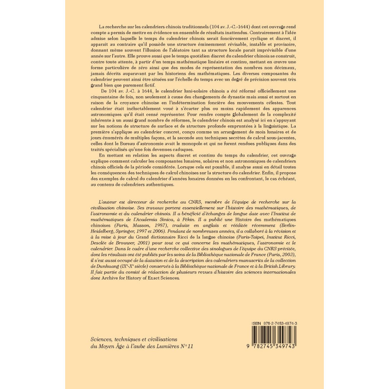 L’auteur est directeur de recherche au CNRS, membre de l’équipe de recherche sur la civilisation chinoise. Ses travaux portent essentiellement sur l’histoire des mathématiques, de l’astronomie et du calendrier chinois. Il a bénéficié d’échanges de longue date avec l’Institut de mathématiques de l’Academia Sinica, à Pékin. Il a publié une Histoire des mathématiques chinoises (Paris, Masson, 1987), traduite en anglais et rééditée récemment (Berlin- Heidelberg, Springer, 1997 et 2006). Pendant de nombreuses années, il a collaboré à la révision et à la mise à jour du Grand dictionnaire Ricci de la langue chinoise (Paris-Taipei, Institut Ricci, Desclée de Brouwer, 2001) pour tout ce qui concerne les mathématiques, l’astronomie et le calendrier. Dans le cadre d’une recherche collective des sinologues de l’équipe du CNRS précitée, dont les résultats ont été publiés par les soins de la Bibliothèque nationale de France (Paris, 2003), il s’est aussi occupé de la datation et de la description des calendriers manuscrits de la collection de Dunhuang (IXe-Xe siècle) conservés à la Bibliothèque nationale de France et à la British Library. Il fait partie du comité de rédaction de plusieurs revues d’histoire des sciences internationales dont Archive for History of Exact Sciences.