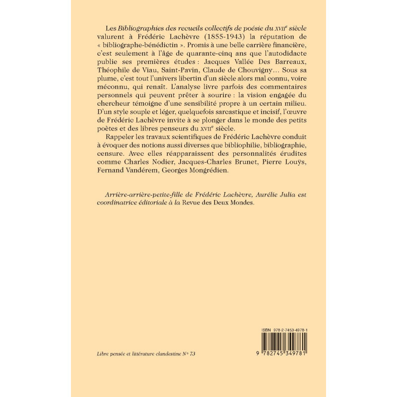 Les Bibliographies des recueils collectifs de poésie du XVIIe siècle valurent à Frédéric Lachèvre (1855-1943) la réputation de « bibliographe-bénédictin ». Promis à une belle carrière financière, c’est seulement à l’âge de quarante-cinq ans que l’autodidacte publie ses premières études : Jacques Vallée Des Barreaux, Théophile de Viau, Saint-Pavin, Claude de Chouvigny… Sous sa plume, c’est tout l’univers libertin d’un siècle alors mal connu, voire méconnu, qui renaît. L’analyse livre parfois des commentaires personnels qui peuvent prêter à sourire : la vision engagée du chercheur témoigne d’une sensibilité propre à un certain milieu. D’un style souple et léger, quelquefois sarcastique et incisif, l’oeuvre de Frédéric Lachèvre invite à se plonger dans le monde des petits poètes et des libres penseurs du XVIIe siècle.