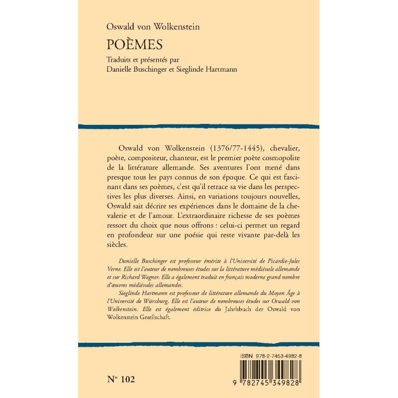 Oswald von Wolkenstein (1376/77-1445), chevalier, poète, compositeur, chanteur, est le premier poète cosmopolite de la littérature allemande. Ses aventures l’ont mené dans presque tous les pays connus de son époque. Ce qui est fascinant dans ses poèmes, c’est qu’il retrace sa vie dans les perspectives les plus diverses. Ainsi, en variations toujours nouvelles, Oswald sait décrire ses expériences dans le domaine de la chevalerie et de l’amour. L’extraordinaire richesse de ses poèmes ressort du choix que nous offrons : celui-ci permet un regard en profondeur sur une poésie qui reste vivante par-delà les siècles.