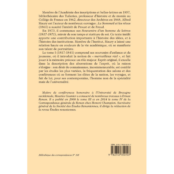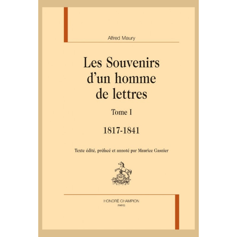 En 1873, il commence ses Souvenirs d’un homme de lettres (1817-1871), miroir de son temps et écriture de soi. Ce texte inédit apporte une contribution importante à l’histoire des idées, et à l’histoire des institutions. Membre de l’Institut, Maury a laissé une relation haute en couleurs de la vie académique, où se manifeste son talent de portraitiste.