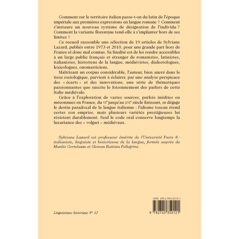 Comment sur le territoire italien passe-t-on du latin de l’époque impériale aux premières expressions en langue romane ? Comment s’instaure un nouveau système de désignation de l’individu ? Comment la variante florentine tend-elle à s’implanter hors de ses limites ? Ce recueil rassemble une sélection de 19 articles de Sylviane Lazard, publiés entre 1973 et 2010, pour une grande part hors de France et donc mal connus. Sa finalité est de les rendre accessibles à un large public français et étranger de romanistes, latinistes, italianistes, historiens de la langue, médiévistes, dialectologues, lexicologues, onomasticiens.