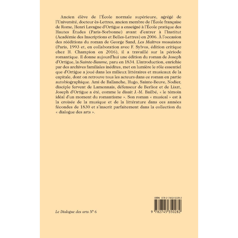 Ancien élève de l’École normale supérieure, agrégé de l’Université, docteur ès-Lettres, ancien membre de l’École française de Rome, Henri Lavagne d’Ortigue a enseigné à l’École pratique des Hautes Études (Paris-Sorbonne) avant d’entrer à l’Institut (Académie des Inscriptions et Belles-Lettres) en 2006. À l’occasion des rééditions du roman de George Sand, Les Maîtres mosaïstes (Paris, 1993 et, en collaboration avec F. Sylvos, édition critique chez H. Champion en 2016), il a travaillé sur la période romantique. Il donne aujourd’hui une édition du roman de Joseph d’Ortigue, la Sainte-Baume, paru en 1834. L’introduction, enrichie par des archives familiales inédites, met en lumière le rôle essentiel que d’Ortigue a joué dans les milieux littéraires et musicaux de la capitale, dont on retrouve tous les acteurs dans ce roman en partie autobiographique. Ami de Ballanche, Hugo, Sainte-Beuve, Nodier, disciple fervent de Lamennais, défenseur de Berlioz et de Liszt, Joseph d’Ortigue a été, comme le disait J.-M. Bailbé, « le témoin idéal d’un moment du romantisme ». Son roman « musical » est à la croisée de la musique et de la littérature dans ces années fécondes de 1830 et s’inscrit parfaitement dans la collection du « dialogue des arts ».