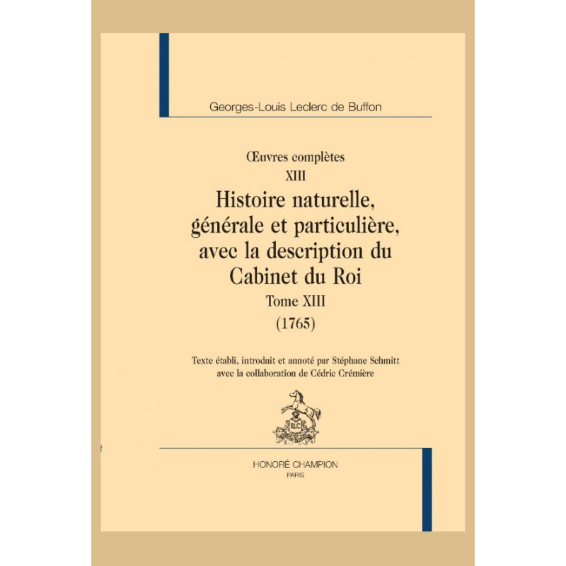 Le treizième tome de l’Histoire naturelle, générale et particulière, le dixième de la série consacrée aux quadrupèdes, paraît en 1765. Comme le précédent, il s’ouvre par un remarquable texte de synthèse, la seconde « Vue de la Nature », dans laquelle Buffon récapitule dans un style brillant quelques-unes de ses principales idées scientifiques, notamment sur les notions d’espèce et d’équilibre de la nature, tout en introduisant quelques innovations audacieuses, par exemple au sujet de l’origine des affinités chimiques.