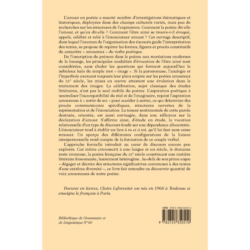 L’amour en poésie a suscité nombre d’investigations thématiques et historiques, déployées dans des champs culturels variés, mais peu de recherches sur les structures de l’expression. Comment la poésie dit-elle l’amour, et qu’en dit-elle ? Comment l’être aimé se trouve-t-il évoqué, appelé, célébré et relié à l’énonciateur aimant ? Cet ouvrage descriptif, dans lequel l’examen de l’organisation des énoncés guide l’interprétation des textes, se propose de repérer les formes, figures et procès constitutifs du caractère « amoureux » du verbe poétique.
