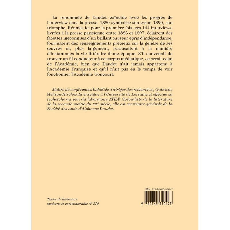 La renommée de Daudet coïncide avec les progrès de l’interview dans la presse. 1880 symbolise son essor, 1890, son triomphe. Réunies ici pour la première fois, ces 144 interviews, livrées à la presse parisienne entre 1883 et 1897, éclairent des facettes méconnues d’un brillant causeur épris d’indépendance, fournissent des renseignements précieux sur la genèse de ses œuvres et, plus largement, ressuscitent à la manière d’instantanés la vie littéraire d’une époque. S’il convenait de trouver un fil conducteur à ce corpus médiatique, ce serait celui de l’Académie, bien que Daudet n’ait jamais appartenu à l’Académie Française et qu’il n’ait pas eu le temps de voir fonctionner l’Académie Goncourt.