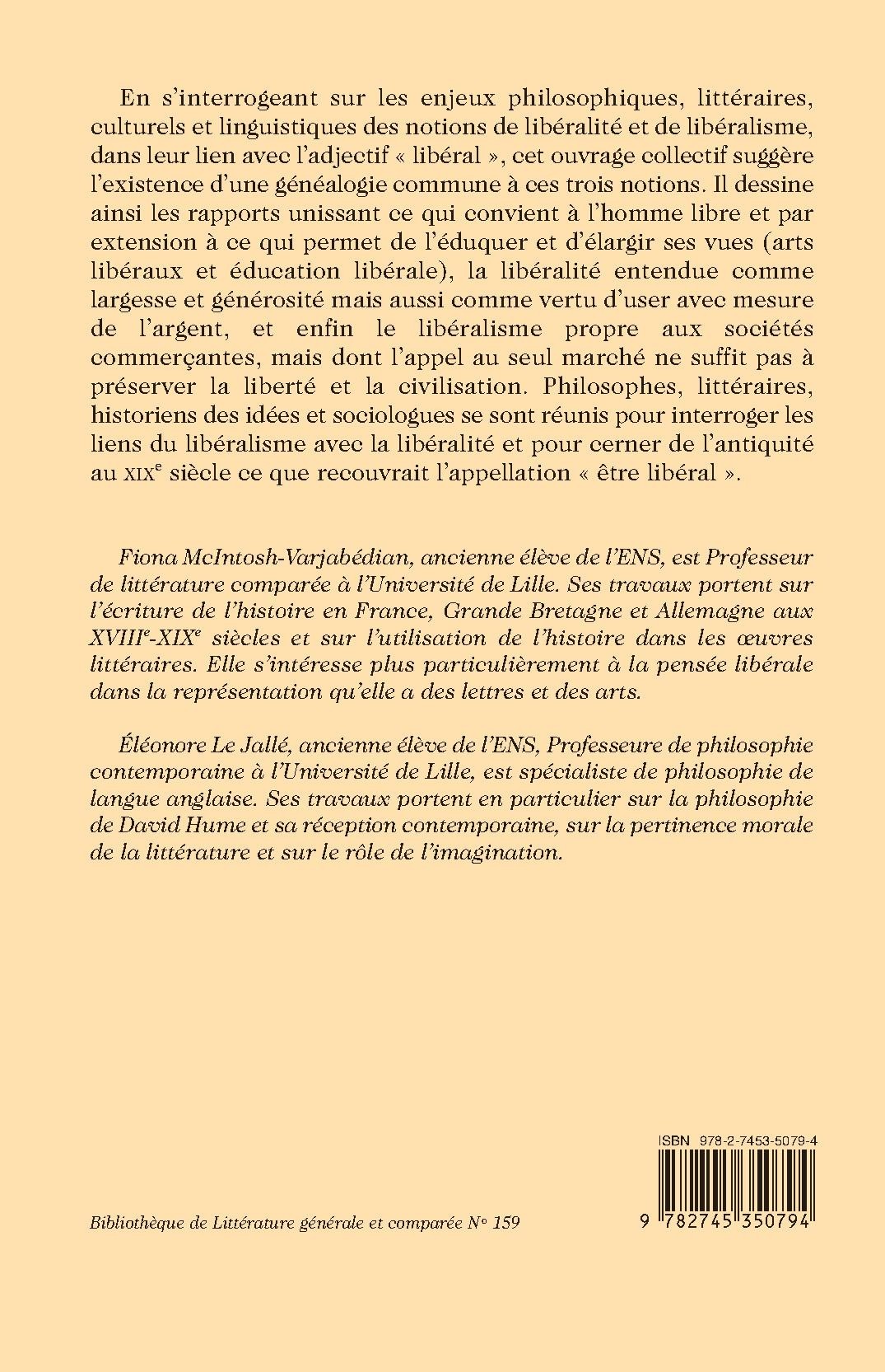 En s’interrogeant sur les enjeux philosophiques, littéraires, culturels et linguistiques des notions de libéralité et de libéralisme, dans leur lien avec l’adjectif « libéral », cet ouvrage collectif suggère l’existence d’une généalogie commune à ces trois notions. Il dessine ainsi les rapports unissant ce qui convient à l’homme libre et par extension à ce qui permet de l’éduquer et d’élargir ses vues (arts libéraux et éducation libérale), la libéralité entendue comme largesse et générosité mais aussi comme vertu d’user avec mesure de l’argent, et enfin le libéralisme propre aux sociétés commerçantes, mais dont l’appel au seul marché ne suffit pas à préserver la liberté et la civilisation. Philosophes, littéraires, historiens des idées et sociologues se sont réunis pour interroger les liens du libéralisme avec la libéralité et pour cerner de l’antiquité au XIXe siècle ce que recouvrait l’appellation « être libéral ».