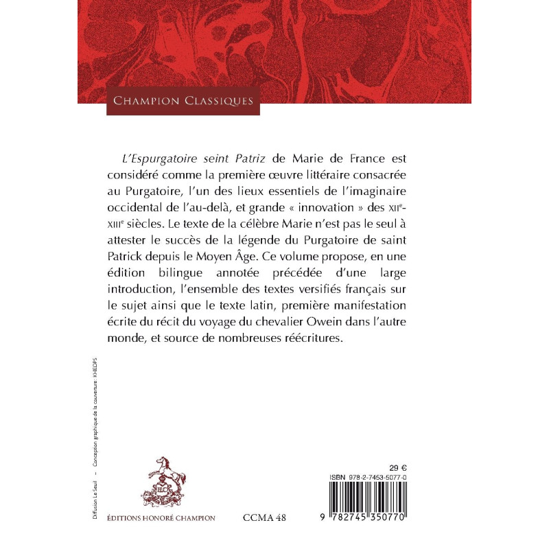 L’Espurgatoire seint Patriz de Marie de France est considéré comme la première oeuvre littéraire consacrée au Purgatoire, l’un des lieux essentiels de l’imaginaire occidental de l’au-delà, et grande « innovation » des XIIe- XIIIe siècles. Le texte de la célèbre Marie n’est pas le seul à attester le succès de la légende du Purgatoire de saint Patrick depuis le Moyen Âge. Ce volume propose, en une édition bilingue annotée précédée d’une large introduction, l’ensemble des textes versifiés français sur le sujet ainsi que le texte latin, première manifestation écrite du récit du voyage du chevalier Owein dans l’autre monde, et source de nombreuses réécritures.