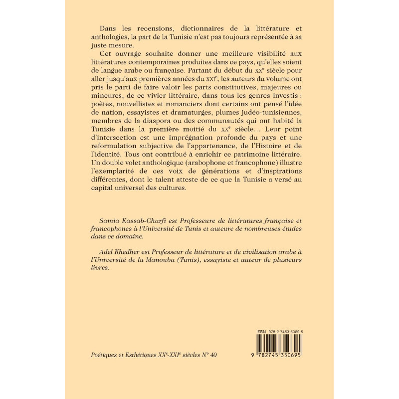 Cet ouvrage souhaite donner une meilleure visibilité aux littératures contemporaines produites dans ce pays, qu’elles soient de langue arabe ou française. Partant du début du XXe siècle pour aller jusqu’aux premières années du XXIe, les auteurs du volume ont pris le parti de faire valoir les parts constitutives, majeures ou mineures, de ce vivier littéraire, dans tous les genres investis : poètes, nouvellistes et romanciers dont certains ont pensé l’idée de nation, essayistes et dramaturges, plumes judéo-tunisiennes, membres de la diaspora ou des communautés qui ont habité la Tunisie dans la première moitié du XXe siècle… Leur point d’intersection est une imprégnation profonde du pays et une reformulation subjective de l’appartenance, de l’Histoire et de l’identité. Tous ont contribué à enrichir ce patrimoine littéraire. Un double volet anthologique (arabophone et francophone) illustre l’exemplarité de ces voix de générations et d’inspirations différentes, dont le talent atteste de ce que la Tunisie a versé au capital universel des cultures.
